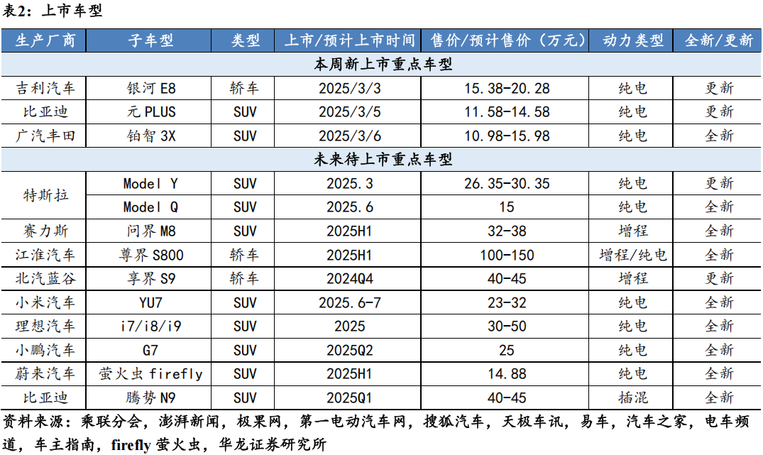 本周观点:问界M8&新M9预售,鸿蒙智行迎来新车周期。问界新M9/M8开始预售,预售价47.8/36.8万元起,分别预计于3月/4月上市。预售开始后36小时,新问界M9/M8小订突破1.8/3.6万台。随着问界新M9和M8开启预售,鸿蒙智行迎来新车周期。尊界S800和享界S9预计分别于2025H1/2025Q2正式上市。华为和上汽于2月签订深度合作协议,或推出“尚界”品牌,首款车型预计于2025Q4推出。鸿蒙智行迎来新车周期,在华为第一梯队智驾和领先的智能座舱配置加持下,新品爆款潜力较大,建议关注鸿蒙智行合作整车标的以及产业链核心供应商。