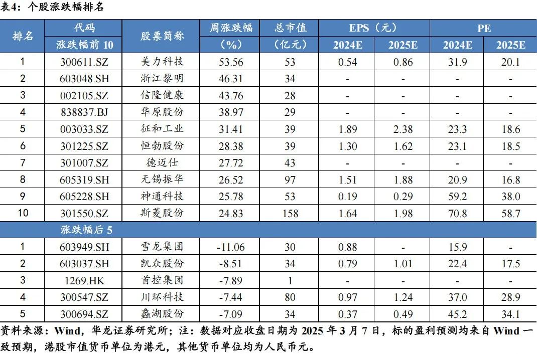 个股方面,本周266只个股上涨,48只个股下跌,涨跌幅前五的个股为美力科技(+53.56%)、浙江黎明(+46.31%)、信隆健康(+43.76%)、华原股份(+38.97%)和征和工业(+31.41%);涨跌幅后五的个股为雪龙集团(-11.06%)、凯众股份(-8.51%)、首控集团(-7.89%)、川环科技(-7.44%)和蠡湖股份(-7.09%)。