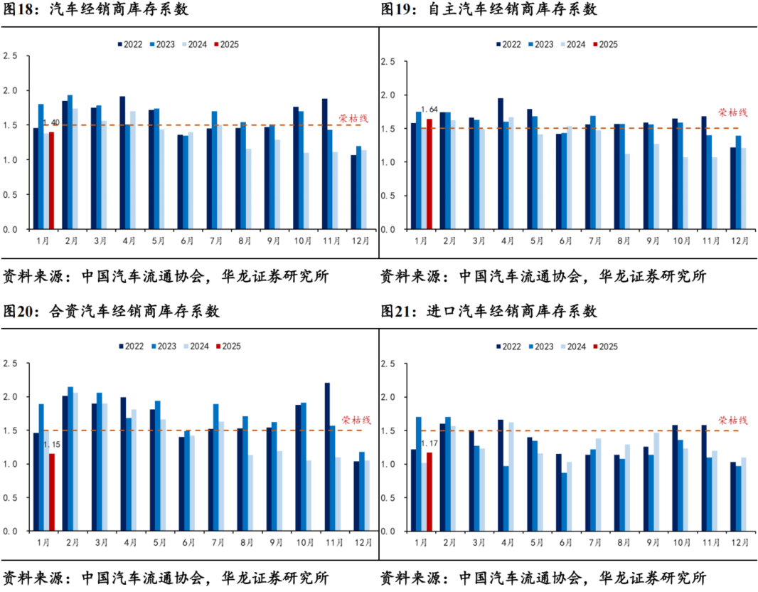 库存整体处于较低水平,厂商补库存动力较足。据中国汽车流通协会数据,2025年1月份汽车经销商综合库存系数为1.40,同比+1.45%,环比+22.81%。库存水平环比12月提升明显,多数经销商在春节前清加大库存力度,并且1月调整进车节奏,但由于1月份整体市场销售不畅,库存压力有所增加。其中自主品牌库存系数为1.64,同比+8.61%,环比+35.54%;合资品牌库存系数为1.15,同比-22.82%,环比+9.52%;进口品牌库存系数为1.17,同比+14.71%,环比+6.36%。