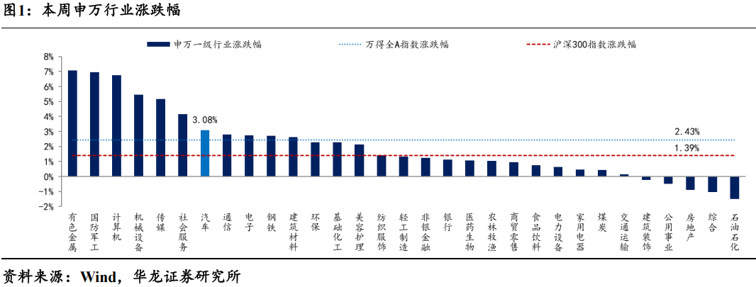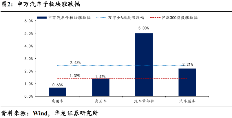 行业方面,本周(2025年3月3日至3月7日)申万汽车板块涨跌幅+3.08%,涨跌幅在31个行业中排名第7。细分板块中,乘用车板块涨跌幅+0.68%,商用车板块涨跌幅+1.42%,汽车零部件板块涨跌幅+5.00%,汽车服务板块涨跌幅+2.21%。同期沪深300涨跌幅+1.39%,万得全A涨跌幅+2.43%。