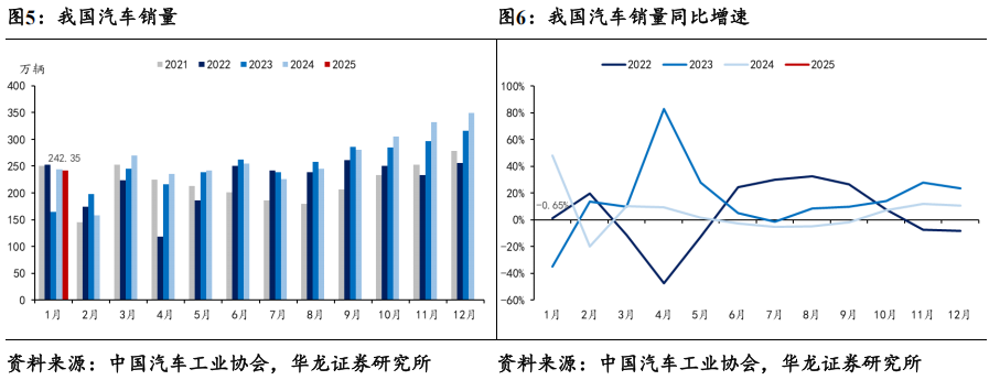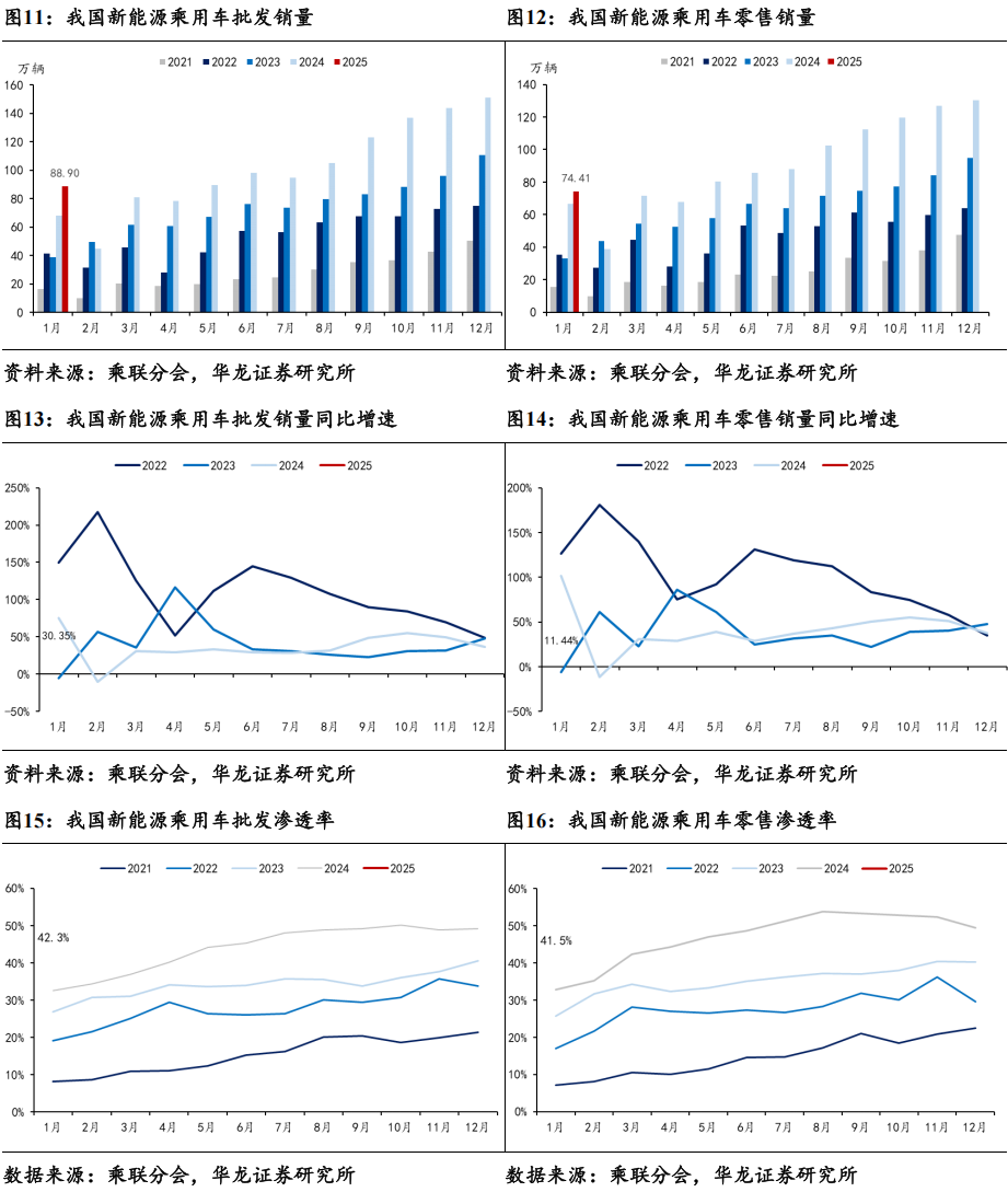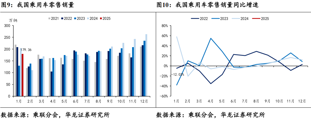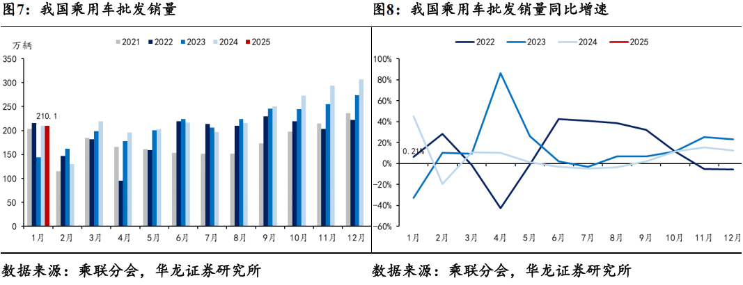 1月乘用车零售销量同比-12.03%。据中汽协数据,2025年1月,我国汽车销售完成242.35万辆,同比-0.65%,环比-30.53%。据乘联分会数据,2025年1月乘用车批发销量完成210.10万辆,同比+0.21%,环比-31.63%,乘用车零售销量完成179.36万辆,同比-12.03%,环比-31.90%。随着2024年国家汽车报废更新与置换更新政策年度性结束,2025年1月车市虽然相关政策仍在延续,1月政策过渡期是2025年购车补贴享受的最佳时间。但由于春节较早,很多消费者提早在2024年末完成春节前的置换购车计划,因此1月车市稍弱于往年车市的火爆节奏,加之1月的有效销售时间少4天以上,因此出现零售负增长是符合预期的。展望2025年,国家以旧换新接续政策已于1月出台,补贴力度维持的同时窗口期较2024年大幅延长,有望托举乘用车市场销量上行。