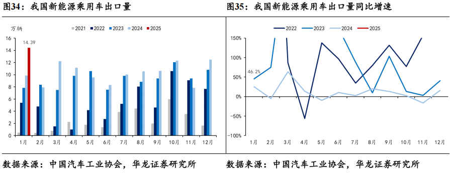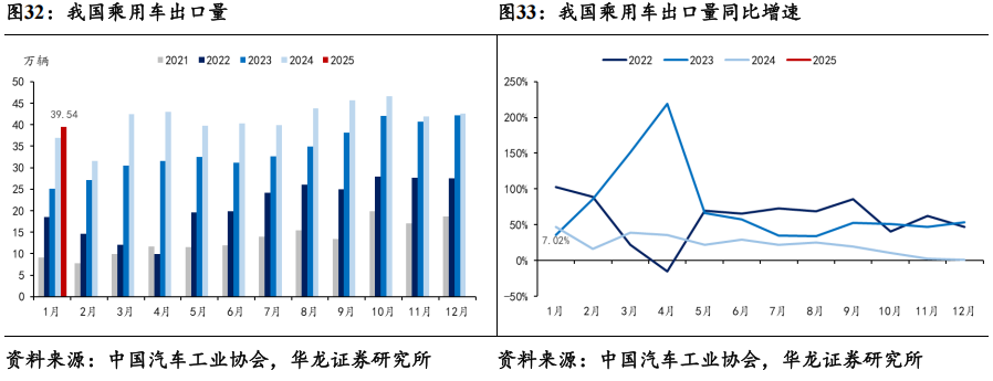 1月乘用车出口同比+7.02%。据中汽协数据,2025年1月乘用车出口销量完成39.54万辆,同比+7.02%,环比-7.21%。其中新能源乘用车出口销量完成14.39万辆,同比+46.23%,环比+15.35%,新能源乘用车出口创历史新高。
