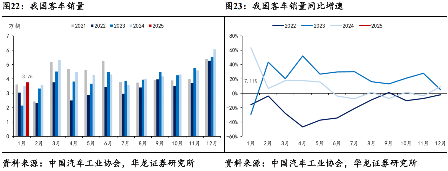 以旧换新政策接续影响下1月销量同比+7.11%。客车方面,据中汽协数据,2025年1月客车销量完成3.76万辆,同比+7.11%,环比-37.94%。2025年1月,大中型客车销量完成0.80万辆,同比+0.26%,环比-68.05%。客车以旧换新政策于2025年1月接续,抵消1月春节影响,客车/大中型客车销量同比均实现增长。