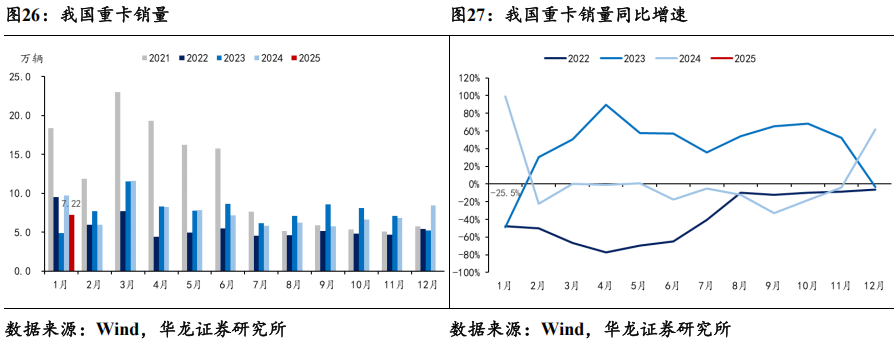 春节影响下重卡销量同环比双降。重卡方面,据Wind数据,2025年1月重卡销量完成7.22万辆,同比-25.50%,环比-14.28%。2024年年底重卡车企冲刺销量目标一定程度上透支购车需求,叠加春节影响下,2025年1月重卡销量同环比双降。