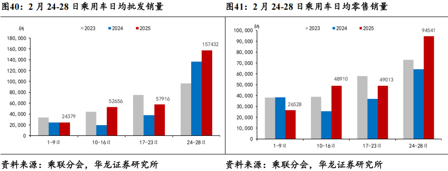 据乘联分会数据,2月24-28日,乘用车市场零售销量完成47.3万辆,同比+45%,较上月同期基本持平;乘用车批发销量完成78.8万辆,同比+13%,较上月同期+33%。