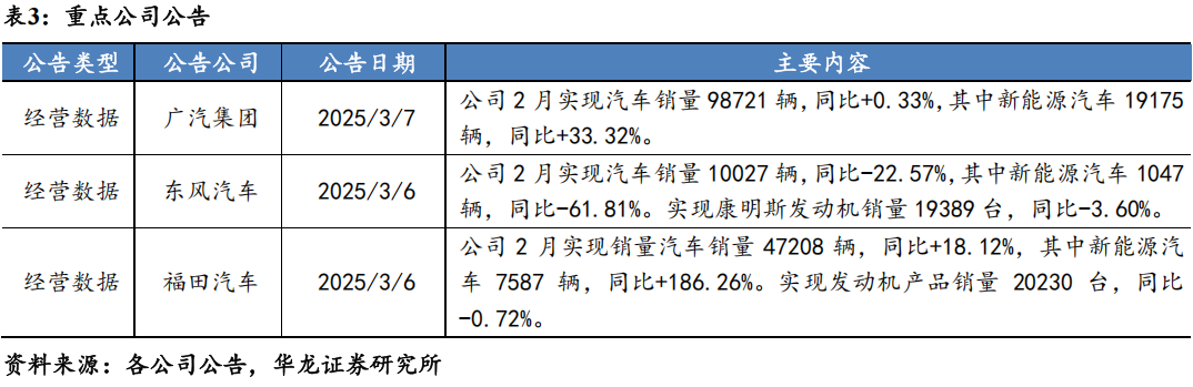 本周行情:申万汽车涨跌幅跑赢沪深300指数1.69pct。2025年3月3日至3月7日,沪深300指数涨跌幅+1.39%,申万汽车板块涨跌幅+3.08%,其中乘用车/商用车/汽车零部件/汽车服务涨跌幅+0.68%/+1.42%/+5.00%/+2.21%。截至2025年3月7日,申万汽车板块PE(TTM)28.9倍,较上周环比上涨。