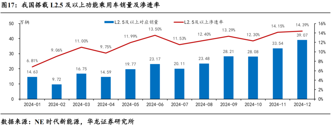 2024年12月L2.5及以上智驾渗透率达14.39%,创历史新高。据NE新时代数据,2024年12月搭载L2.5及以上智驾系统乘用车零售销量达39.07万辆,渗透率14.39%,创历史新高。2024年搭载L2.5及以上智驾系统乘用车累计销量271.12万辆,累计渗透率12.93%。随着比亚迪等新能源龙头企业逐步将高速/城区NOA等高阶智驾功能下放至10万元级别车型,2025年L2.5及以上渗透率有望快速提升。