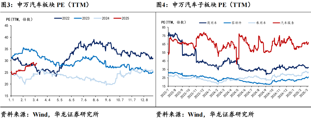 估值方面,截至2025年3月7日收盘,申万汽车板块PE为28.9倍, 较上周环比上涨。子板块中,乘用车/商用车/汽车零部件/汽车服务板块PE为37.0/31.5/26.0/66.3倍。