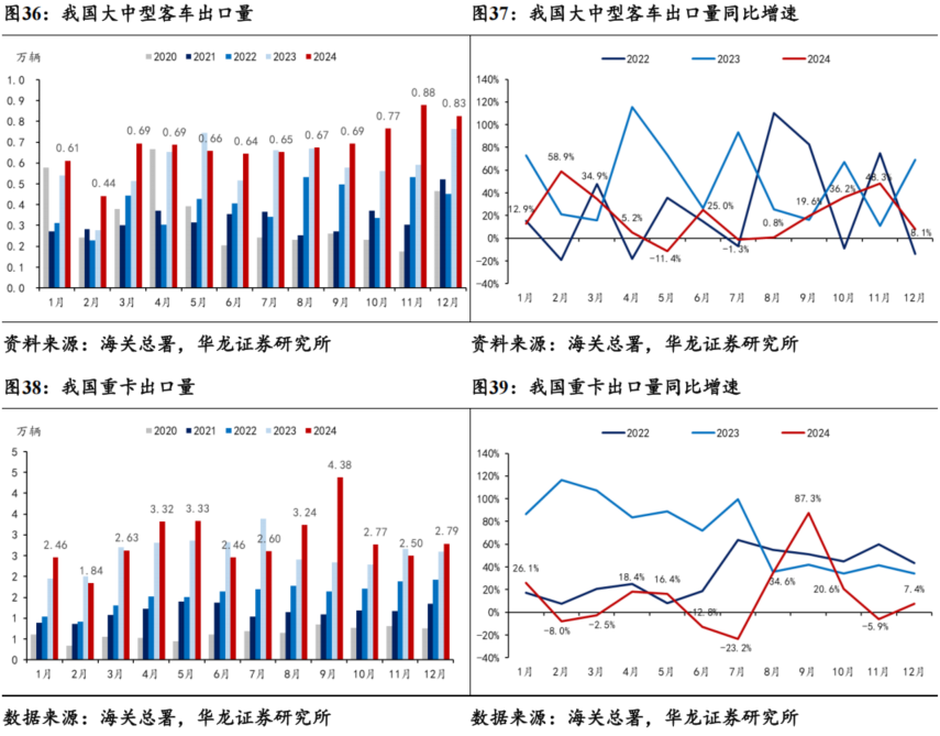 12月大中型客车/重卡出口量同比均实现增长。据海关总署数据,2024年12月大中型客车出口销量完成0.83万辆,同比+8.14%,环比-5.91%;2024年12月重卡出口销量完成2.79万辆,同比+7.44%,环比+11.43%。