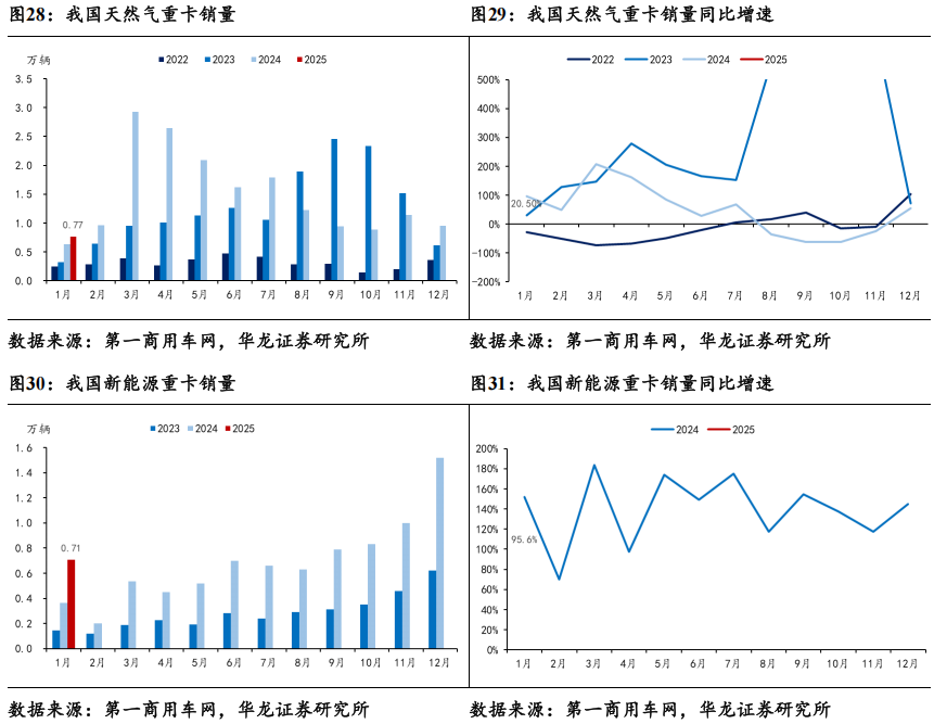 成本优势+补贴倾斜延续新能源重卡高景气度。据第一商用车网数据,2025年1月天然气重卡销量完成0.77万辆,同比+20.500%,环比-19.66%,在LNG价位仍维持低位运行,油气价差下天然气重卡长途运输经济性突显,环比销量下滑主要系2024年底车企销量冲刺一定程度上透支购车需求。2025年1月新能源重卡销量完成0.71万辆,同比+95.56%,环比-53.39%,上游硅料价格下降带动终端产品降价,叠加运营成本优势以及营运车辆补贴额度倾斜,新能源重卡景气度有望延续。