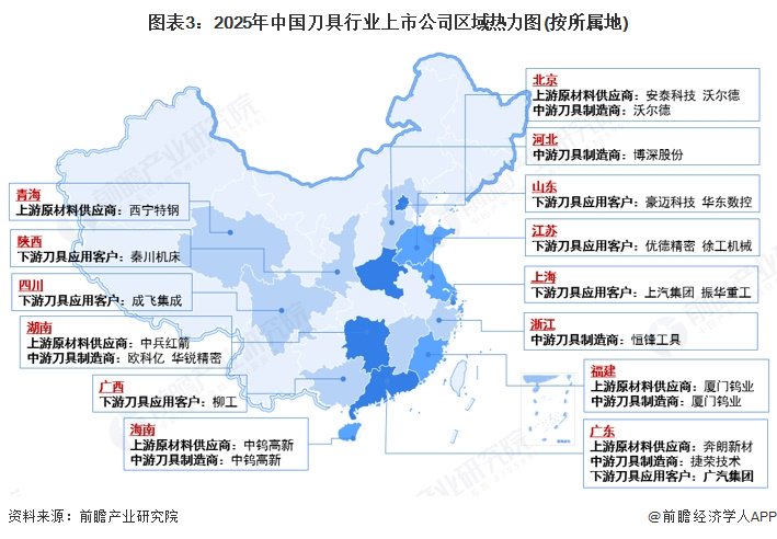 刀具产业产业链区域热力地图:上游集中在中部地区,中游集中在制造业强区从上市企业区域分布情况来看,刀具产业链上游原材料供应商主要集中在中部地区,中游刀具制造商集中在制造业基础较强的区域,下游刀具应用客户分布更为分散。