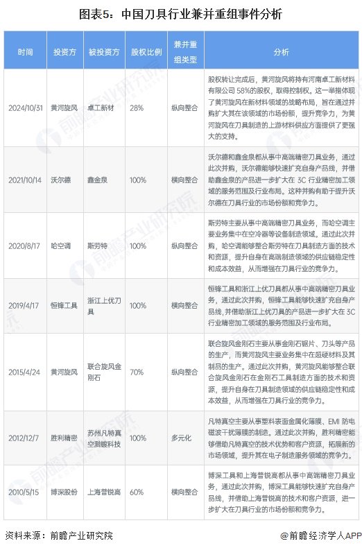 中国刀具行业兼并重组活动近年来集中于纵向整合和横向整合两大类型,同时涉及一定的多元化拓展。纵向整合方面旨在通过控制上游资源和整合供应链提升竞争力。横向整合主要目标是扩充产品线、增强市场覆盖,并提升行业竞争力。整体来看,兼并重组成为刀具企业优化产业链、扩大市场份额和提升核心竞争力的重要手段。