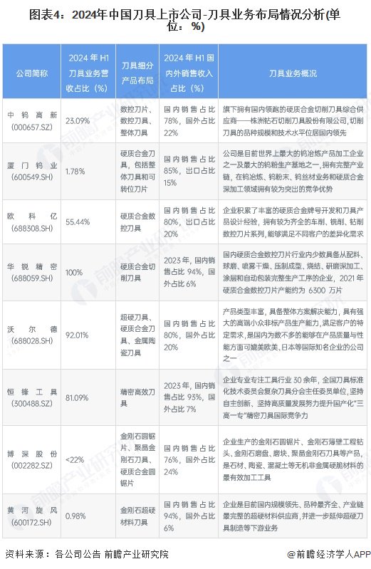 在行业相关上市公司中,华锐精密和沃尔德的刀具业务占比均超过80%。在细分产品布局方面,企业主要集中在硬质合金、超硬和金刚石刀具领域,如博深股份和黄河旋风重点布局金刚石刀具。大部分公司主要依赖国内市场,但少数企业如欧科亿和博深股份具有较为显著的出口业务,国外销售占比达到20%以上。
