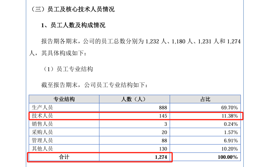 在2023年12月,岷山环能向北交所递交的上市招股书(申报稿)中明确表示,在2020年至2022年中,其共有员工1232人、1180人和1231人,基本保持稳定。而截止到2023年6月30日,其共有员工1274人。