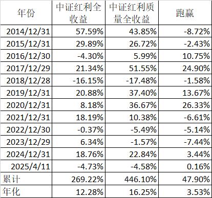 就像每个人的口味不同,加上不同的调料后总有人觉得不好吃一样,加上了各种因子后短期也有可能跑输,我们以中证红利全收益和加上质量因子的中证红利质量全收益为例: