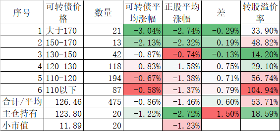 475只可转债平均下跌0.86%,对应正股平均下跌1.46%。我的主仓20只可转债平均下跌1.22%,对应正股平均下跌2.72%。账户合计实际下跌1.25%。