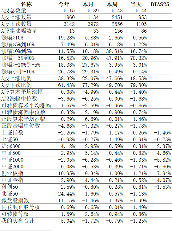 953只个股上涨、4105只个股下跌,涨幅中位数-1.68%。