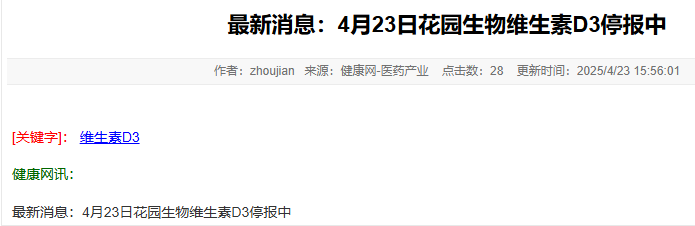 另外,健康网显示,国内维生素D3生产龙头花园生物于4月23日停止报价。对此,记者致电花园生物国内销售部求证,接线人员表示,对停报一事不清楚。
