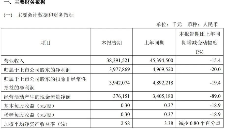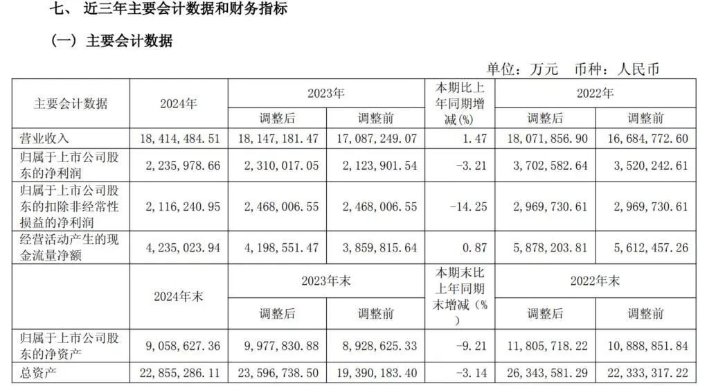 报告期内,公司实现营业收入 1,841.45 亿元,同比增加 26.73 亿元,增长1.47%;实现利润总额438.36 亿元,同比减少 11.64 亿元,降幅 2.59%;归属于上市公司股东的净利润223.60 亿元,同比减少 7.40 亿元,降幅 3.21%;基本每股收益 2.31 元,同比减少 0.07 元,降幅3.21%。
