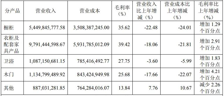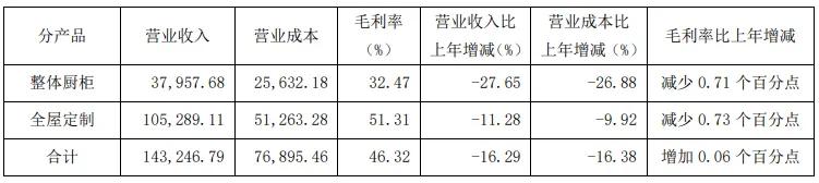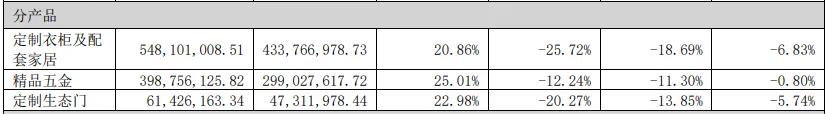 分产品来看,报告期内,定制衣柜及配套家居实现营收5.48亿元,占营收比重53.39%,同比下降25.72%;精品五金实现营收3.99亿元,占营收比重38.84%,同比下降12.24%;定制生态门实现营收6142.62万元,占营收比重5.98%,同比下降20.27%;其他业务实现营收1837万元,占营收比重1.79%,同比增长22.11%。