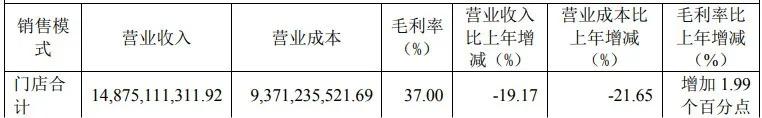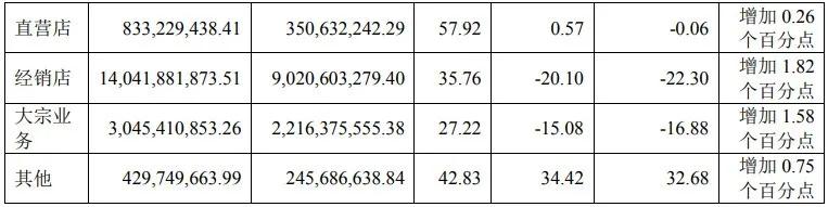 从收入渠道看,公司经销渠道实现营业收入140.42亿元,同比下降20.10%;大宗渠道实现营业收入30.45亿元,同比下降15.08%;直营渠道实现营业收入8.33亿元,同比增长 0.57%;海外渠道实现营业收入4.30亿元,同比增长34.42%。