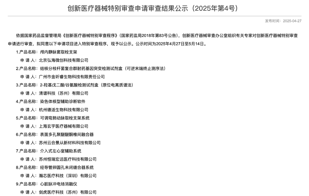 2025年4月27日,NMPA公布了创新医疗器械特别审查申请审查结果公示(2025年第4号),有9款产品进入创新通道。