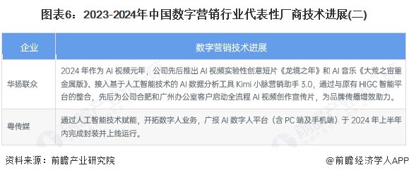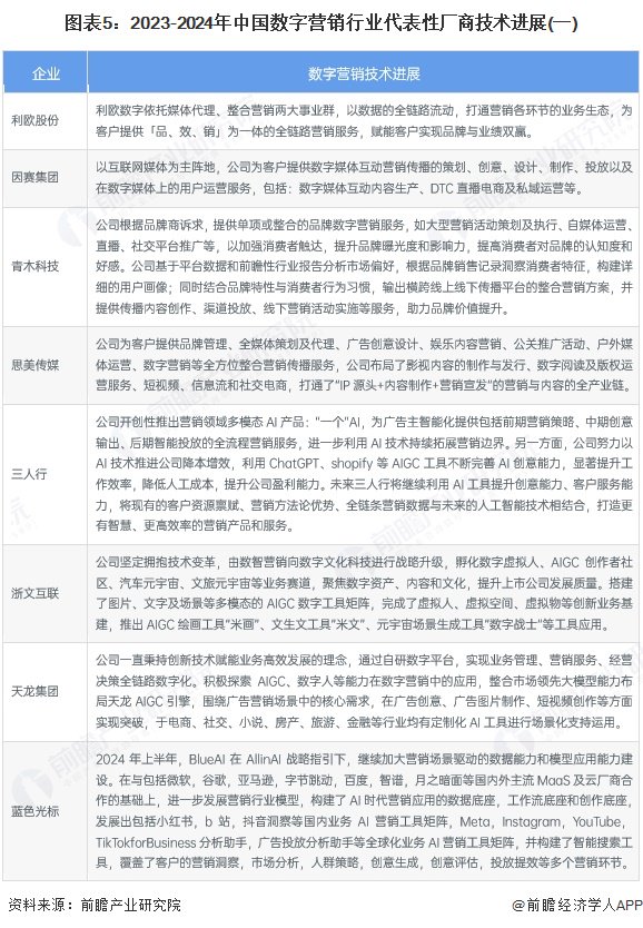 从代表性厂商的技术进展情况来看,几乎所有的数字营销代表厂商均开展了AI 技术的相关布局,表明AI技术将深度引领行业变革。2023-2024年中国数字营销代表性厂商技术进展情况如下: