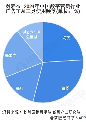 根据秒针营销科学院的数据,从上游AI广告主使用AI工具的频率来看,截至2024年,50%以上的广告主每周均有AI工具的使用行为发生,表明AI工具在上游内容供应上已实现了初步渗透,数字营销产业从业人员在内容生产上逐步发展出了AI工具的使用习惯。
