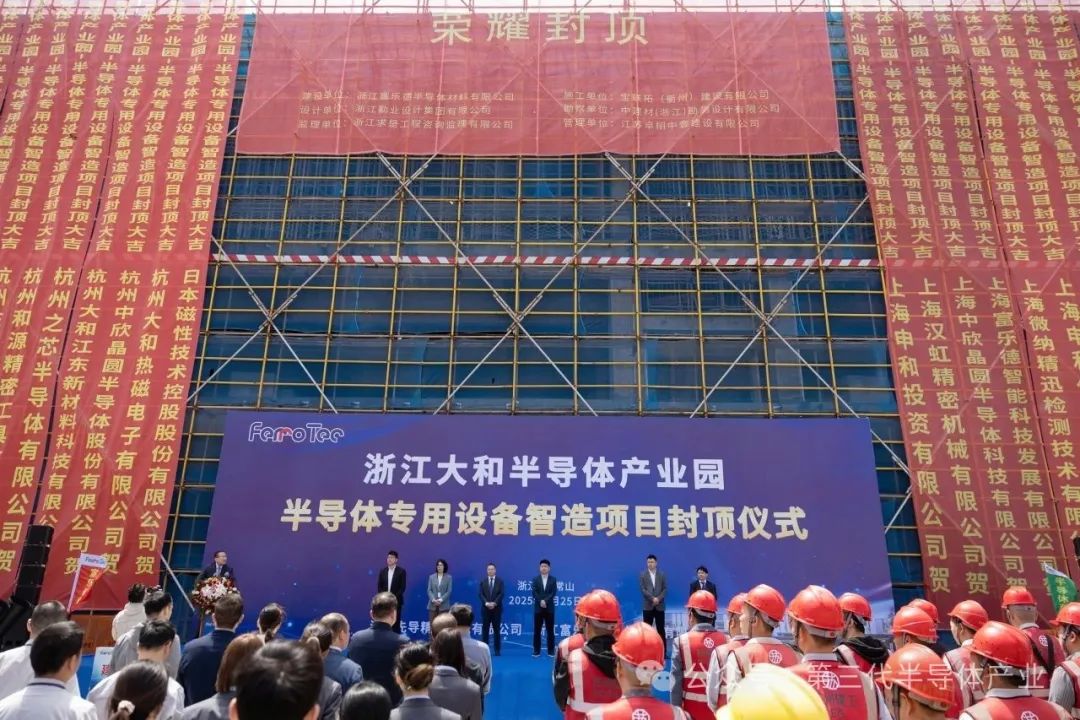4月25日,浙江大和半导体产业园暨半导体专用设备智造项目荣耀封顶!该项目从2024年8月23日开工奠基,到2025年4月25日的喜结金顶,仅用时245天即完成了6万平方米厂房的建设。