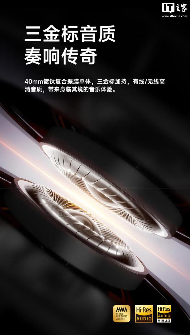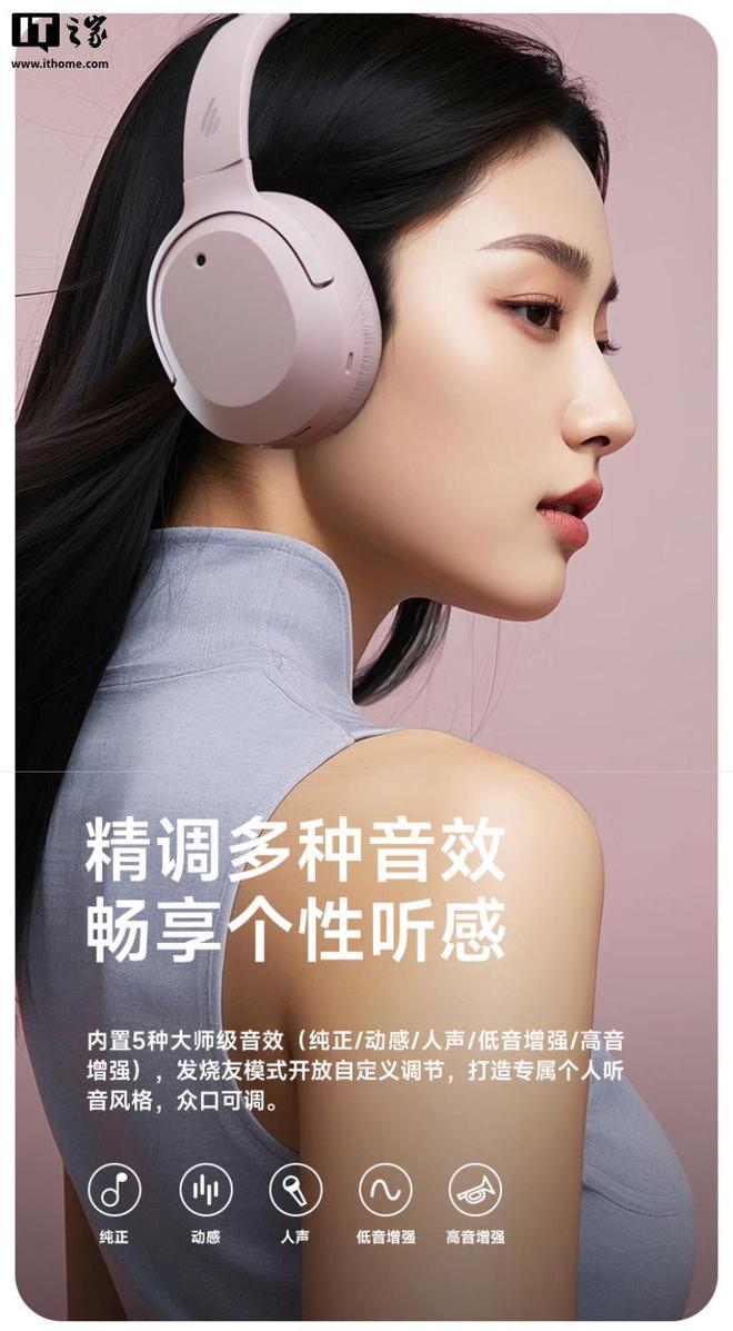外观方面,该耳机可选沙丘白、月光蓝、烟霞粉等配色,配备40mm镀钛复合振膜单体,内置5种音效(纯正 / 动感 / 人声 / 低音增强 / 高音增强),提供-49 dB降噪,频响范围20Hz-40kHz。