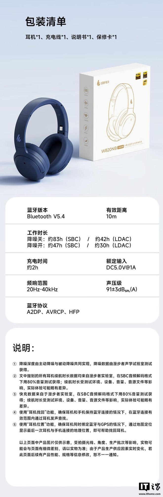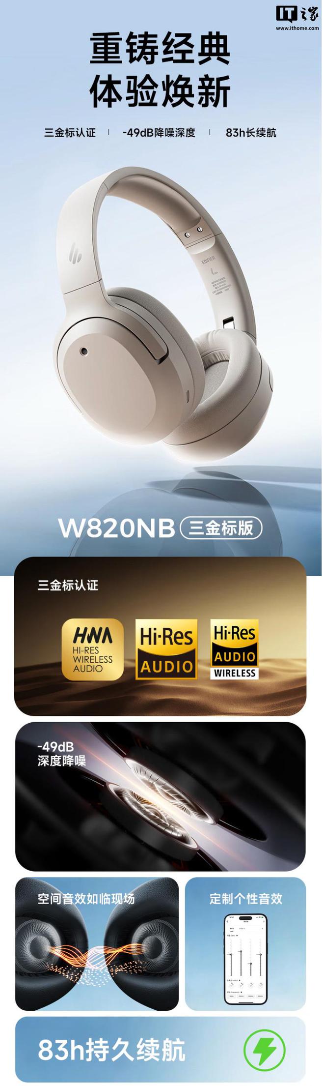 IT之家 5 月 11 日消息,漫步者现已在京东上架一款 W820NB 三金标版头戴式耳机,该耳机主打“-49dB降噪深度、83小时续航”,定价为369元(国补后 313.65元)。