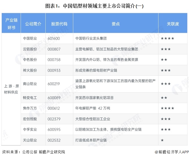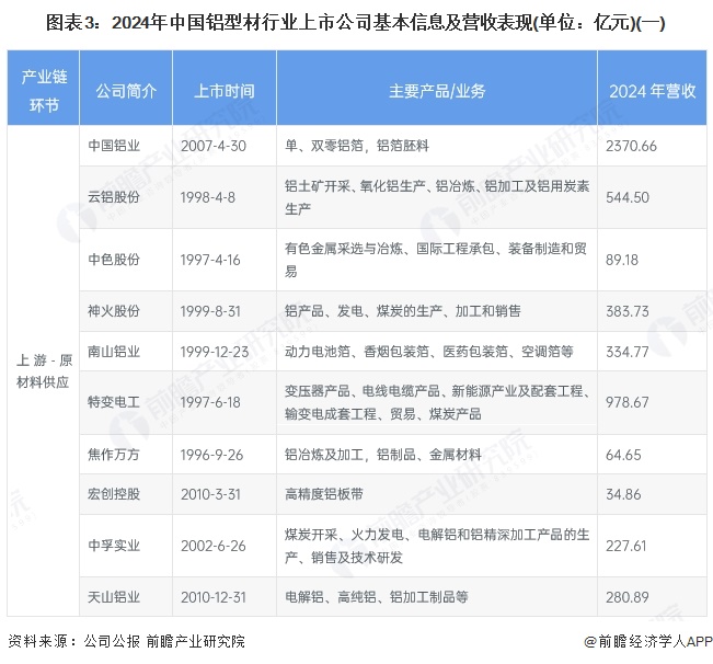 行业主要上市公司:中国铝业(SH:601600)、南山铝业(SH:600219)、云铝股份(SZ:000807)、神火股份(SZ:000933)、明泰铝业(SH:601677)、中孚实业(SH:600595)、新疆众和(SH:600888)、豪美新材(SZ:002988)、亚太科技(SZ:002540)、天山铝业(SZ:002532)等