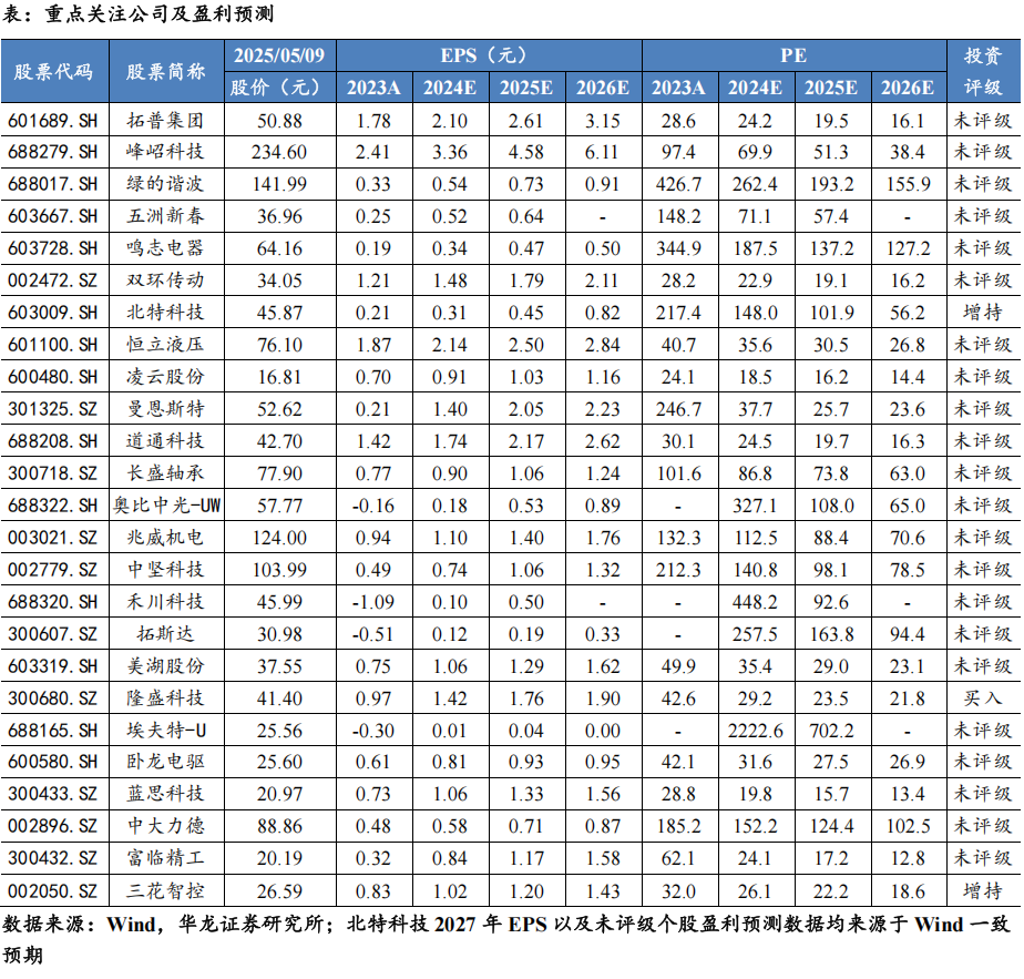 投资建议:美的、华为和比亚迪等多家制造业/科技大厂加速人形机器人领域布局,维持行业“推荐”评级。个股方面,建议围绕“高确定性+增量技术”两条主线,紧密跟踪①特斯拉Optimus量产进度及国产供应链订单释放;②国内华为、宇树链等新进展,把握2025年产业扩张期的确定性红利。个股方向可以关注:(1)特斯拉链:三花智控、拓普集团、峰岹科技、绿的谐波、五洲新春、鸣志电器、双环传动、北特科技、恒立液压、凌云股份等。(2)宇树链:长盛轴承、曼恩斯特、道通科技、奥比中光-UW等。(3)华为链:兆威机电、中坚科技、禾川科技、埃夫特-U、拓斯达、湘油泵、隆盛科技等。(4)智元链:卧龙电驱、蓝思科技、中大力德、富临精工等。