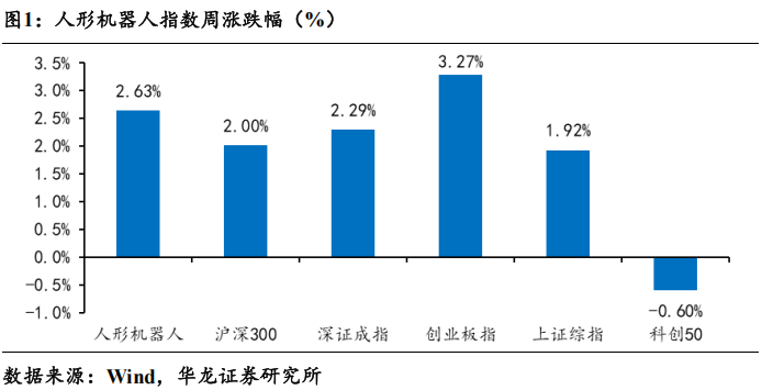 行业方面,2025年5月6日至2025年5月9日,人形机器人指数涨跌幅+2.63%。同期沪深300涨跌幅+2.00%,上证综指涨跌幅+1.92%,深证成指涨跌幅+2.29%,创业板指涨跌幅+3.27%,科创50涨跌幅-0.60%。