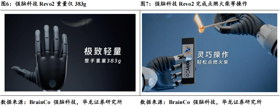 强脑科技发布灵巧手Revo2,握重比52:1创行业新高。强脑科技全球最轻量专业级灵巧手Revo2,重量仅383g,较行业平均水平轻了30%;长160mm,宽76mm,与人类女性手大小类似;整手握力≥50N,单手承载20kg;工作噪声水平不超过50分贝,低于普通办公室背景音,同时内置了多重保护机制,包括防撞、过流、过热保护,确保在各种环境下都能安全可靠地工作,大幅降低了返修的概率,使得Revo 2本质上更适配实验室、家庭服务、工业应用等多元化场景;内置三位触觉传感器,精准感知指尖的受力信息以及物体硬度、纹理及受力方向等,实现“手眼协调”级的精细操作,可以轻松完成点燃火柴等任务。