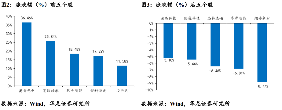 个股方面,2025年5月6日至2025年5月9日,我们跟踪的人形机器人相关公司中涨跌幅前五的分别为奥普光电(+36.46%)、襄阳轴承(+25.84%)、远大智能(+18.48%)、锐科激光(+17.32%)和安乃达(+11.58%);涨跌幅后五的分别为固高科技(-5.18%)、隆盛科技(-5.44%)、思特威-W(-6.46%)、赛摩智能(-6.81%)和翔楼新材(-8.77%)。