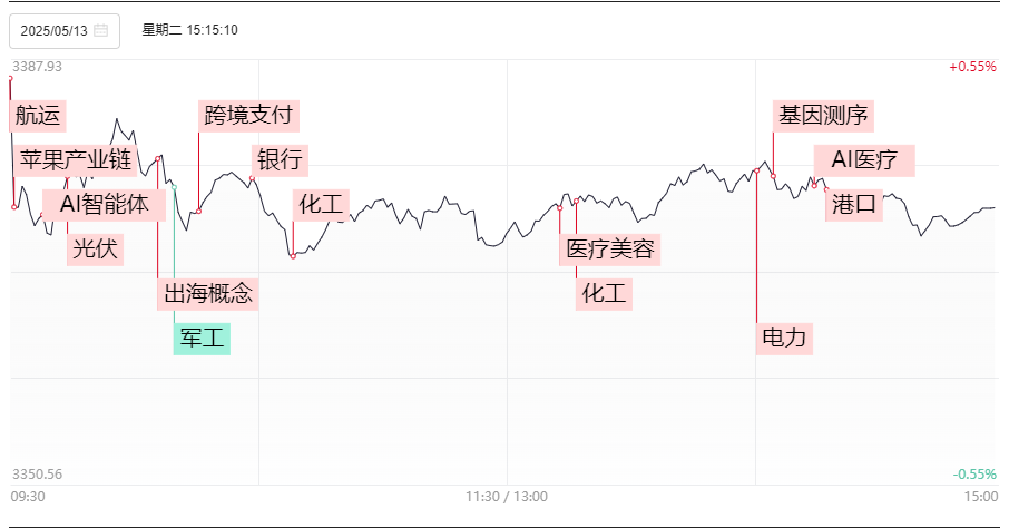三大指数全天高开低走,收盘涨跌不一。截至收盘,沪指涨0.17%,深证成指跌0.13%,创业板指跌0.12%。两市个股跌多涨少,下跌个股超3200只;两市全天成交1.29万亿元,较上一日缩量成交195亿元,内资主力资金净卖出416亿元;两市涨跌中位数为-0.38%。盘面上,中美利好消息落地,主力资金出逃,题材概念多数下行。港口航运概念午后爆发,连云港、南京港等多股涨停;自由贸易港、电商、服装家纺等出口概念全天走强,浦东建设、酷特智能等多股涨停;光伏概念全天强势,欧晶科技、协鑫集成等涨停;环氧丙烷、染料等化工概念集体拉升,红墙股份、尤夫股份等涨停;银行板块创下阶段新高,上海银行、江苏银行等多股创历史新高;医药概念、网红经济、宠物经济、黄金概念等表现强势。跌幅方面,军工电子、军工信息化、大飞机等军工产业链全线回调,华伍股份跌超10%;低空经济、人形机器人、商业航天、无人驾驶等新质生产力方向集体走低,奥普光电跌停;半导体、芯片、光刻机等科技自主可控概念集体下行;汽车热管理、汽车零部件、新能源汽车等汽车产业链全线下挫;AI眼镜、AI手机、消费电子概念集体弱势;算力、光模块、智谱AI、Sora等AI产业链全线下行。消息面上,1、中美日内瓦经贸会谈联合声明发布,将对此前加征的关税进行调整,未来双方将建立机制,继续就经贸关系进行协商;2、有传闻称,业内正计划由硅料行业排名前六厂商来收购剩余所有硅料产能,且某头部厂商提议减产挺价,并设置了挺价的目标区间;3、特朗普修令,下调对华小额包裹关税至54%。