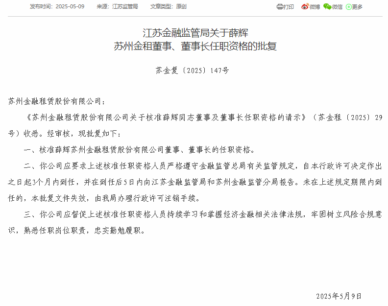 近日,江苏金融监管局官网公布行政许可批复,核准薛辉苏州金融租赁股份有限公司董事、董事长的任职资格。