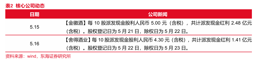 白酒:行业淡季调整,酒企积极破局。当前处于白酒消费淡季,在行业调整的背景下,酒企通过渠道拓展、精细化运营、产品创新等方式寻求发展。贵州茅台:茅台酒社会电商渠道市场营销座谈会议指出,今年1-4月,茅台酒市场稳定增长,主流电商渠道茅台酒销售表现亮眼,同比增长超30%。泸州老窖:公司与经销商密切合作,围绕消费者开瓶为核心,动态调整销售指标及市场政策,保障客户合理利润空间,确保市场良性发展。公司以终端配额制为基础开展渠道库存管理,现阶段渠道库存情况安全可控。批价更新:上周飞天茅台批价小幅下跌。截至5月18日,2024年茅台散飞批价2120元,周、月环比持平;2024年茅台原箱批价2180元,周环比下降10元、月环比上升40元。五粮液普五批价为950元,周、月环比持平。国窖1573批价860元,批价周、月环比持平。白酒板块估值处于底部区间,且基本面预期较低,风险充分释放,期待后续政策持续加码带动白酒需求修复。白酒行业竞争加剧,酒企业绩分化明显,市场份额向头部加速集中,建议关注高端酒和区域龙头。