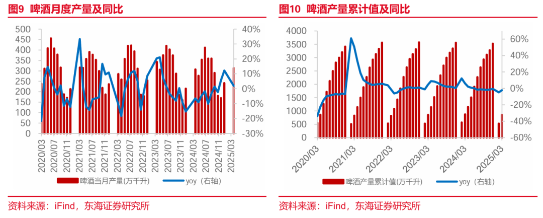 啤酒:气温升高,关注销量边际改善。根据国家统计局数据,2025年1-3月中国规模以上啤酒企业产量累计854.1万千升,同比-2.2%,淡季行业积极消化库存。部分啤酒企业一季度销量迎来快速增长,行业整体销量稳健。随着天气温度升高及消费政策持续刺激下,啤酒销量有望迎来边际改善,叠加大麦成本持续下行,盈利端有较强确定性。