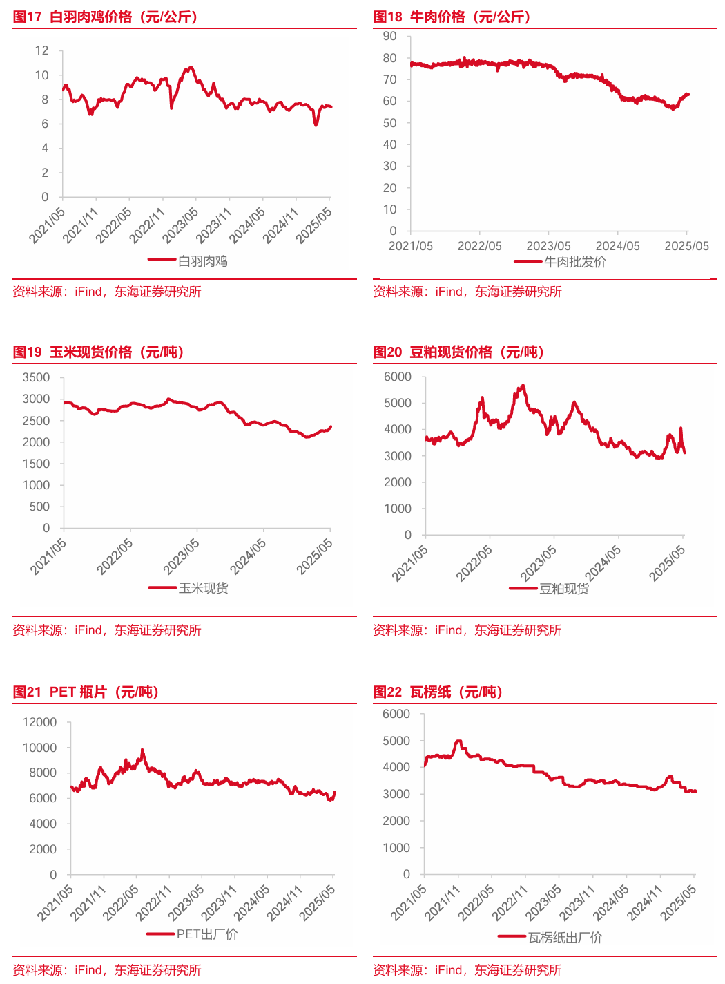 包材价格:截至2025年5月16日,PET瓶片6450吨,周环比+5.74%,同比-9.79%;瓦楞纸3110元/吨,周环比-0.64%,同比-7.03%。