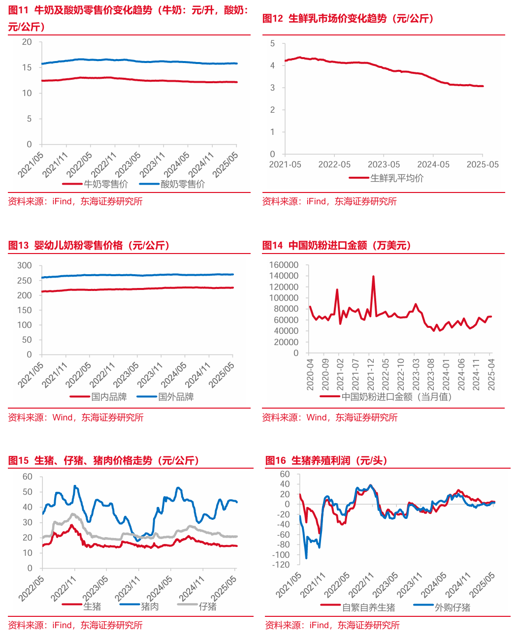 乳制品价格:截至2025年5月9日,牛奶零售价12.16元/升,周环-0.08%,同比-0.82%;酸奶零售价15.78元/公斤,周环比-0.13%,同比-1.50%;生鲜乳3.07元/公斤,同比-10.00%;国内品牌婴幼儿奶粉零售价225.79元/公斤,国外品牌270.45元/公斤。另外4月中国奶粉进口金额为66112.9万美元。