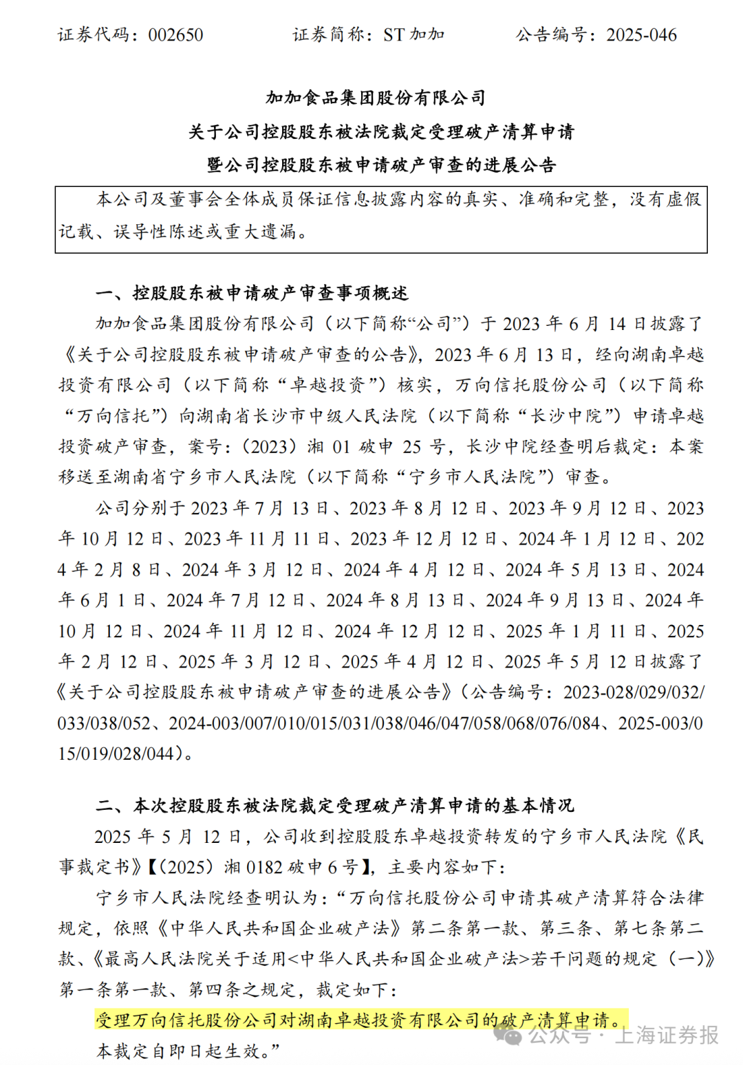 5月14日,ST加加发布公告称,5月12日公司收到控股股东卓越投资转发的湖南省宁乡市人民法院《民事裁定书》。