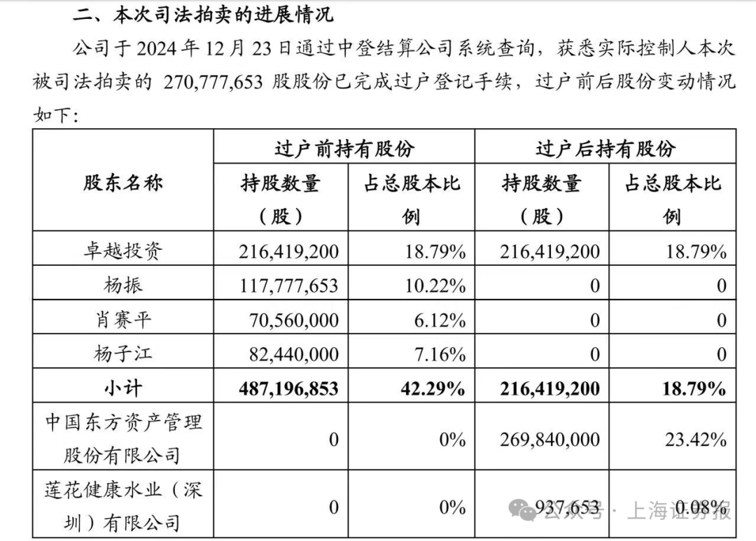 2024年11月,ST加加的两宗股权在阿里拍卖平台进行拍卖,东方资产竞得绝大部分ST加加股份。