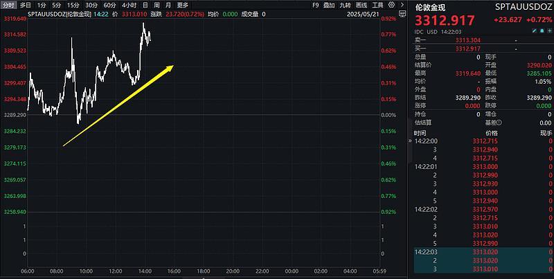 受美元疲软及国际地缘紧张局势升温影响,今早盘间,伦敦现货黄金价格攀升,突破3310美元/盎司,现价报3312美元/盎司。