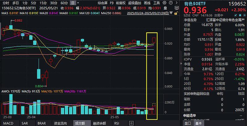 5月21日,$有色50ETF(159652)放量上涨2.30%,冲击两连涨。
