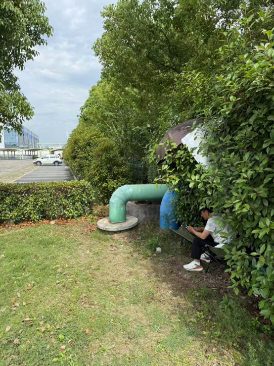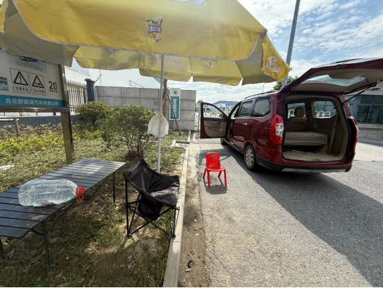 记者注意到,合众新能源桐乡生产基地正大门的草坪一侧,上述几位特殊的维权人用雨伞和塑料,搭起了一个简陋的棚子,以便遮阳避雨。“我们在附近临时租了房子,另外还有2辆车,其他人会时不时在几个门之间来回走动。”上述债权人称。