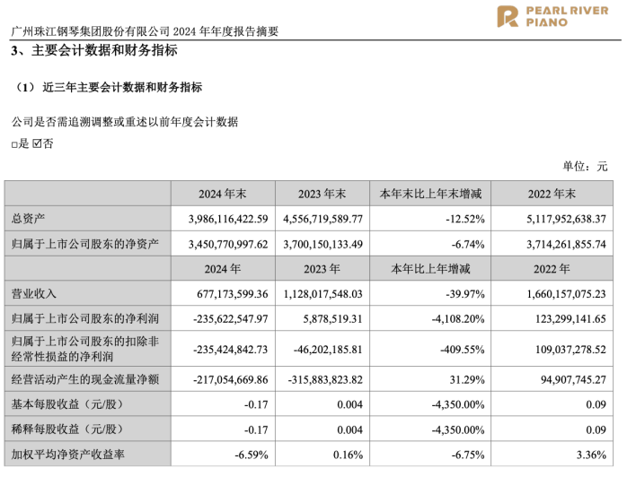 2024年,珠江钢琴营收6.77亿,同比下降39.97%,营收接近腰斩,归属于母公司股东的净利润是亏损2.36亿,同比下降4108.2%。