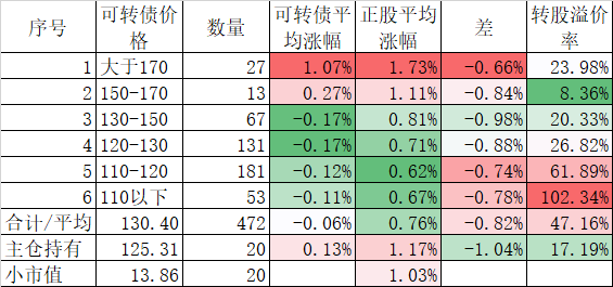 472只可转债平均下跌0.06%,对应正股平均上涨0.76%;我的主仓20只可转债平均上涨0.13%,对应正股平均上涨1.17%。