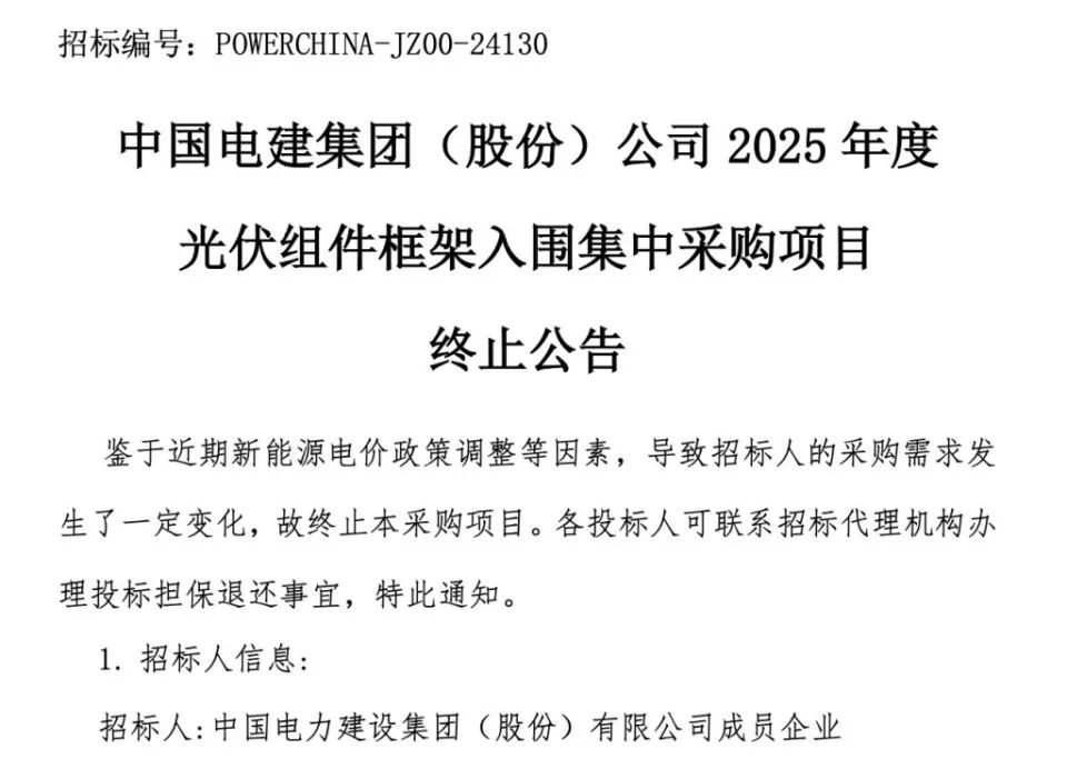 中国电建在最新公告中表示,鉴于近期新能源电价政策调整等因素,导致招标人的采购需求发生了一定变化,故终止采购项目。